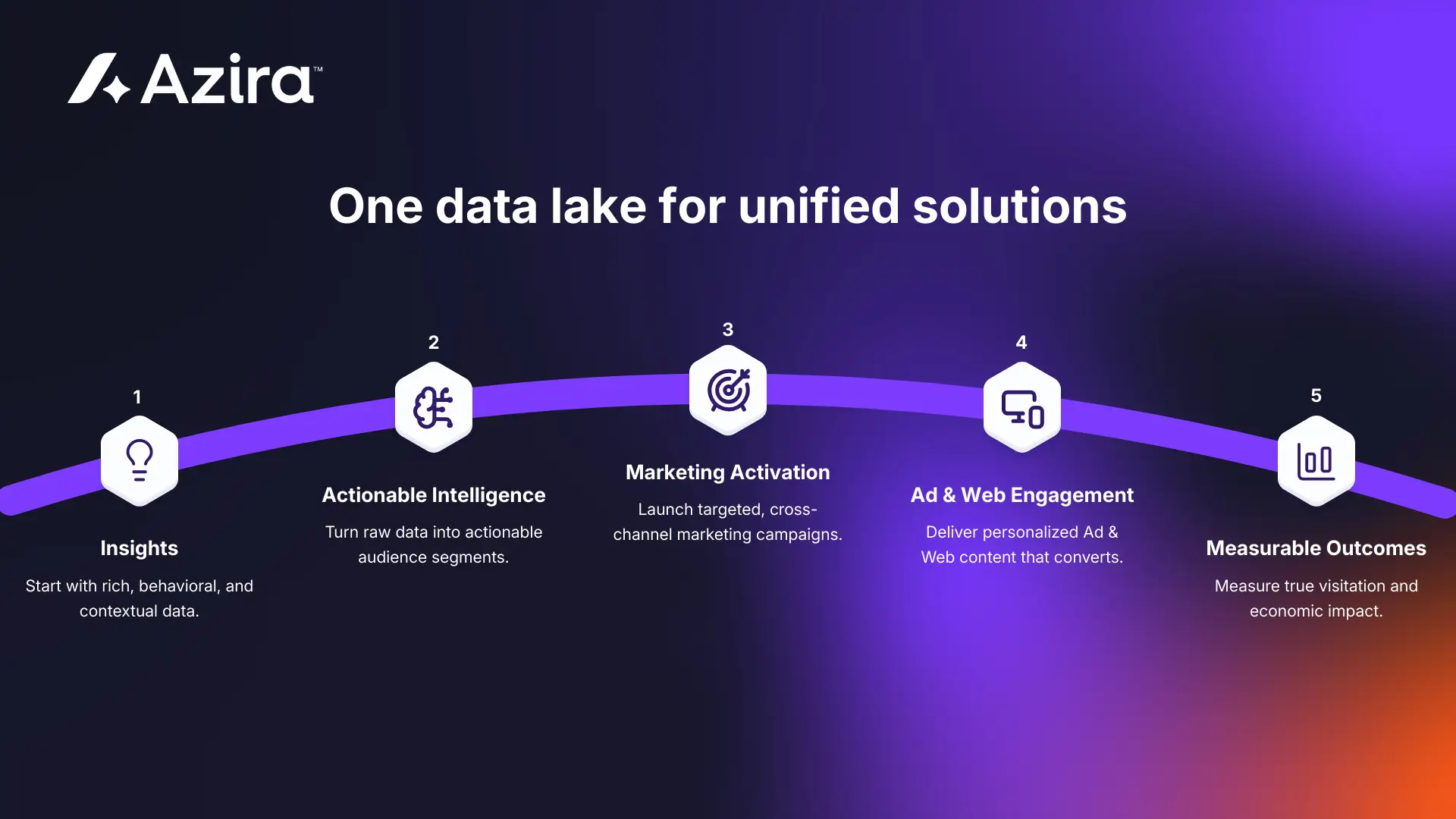 Azira’s location intelligence platform empowers destinations and brands to activate smarter media buying strategies across mobile, CTV, audio, digital out-of-home, and more, delivering campaigns in premium, high-quality environments. Every impression is measurable, from ad engagement to real-world visitation, giving marketers the proof and confidence they need to optimize performance and drive impact.
